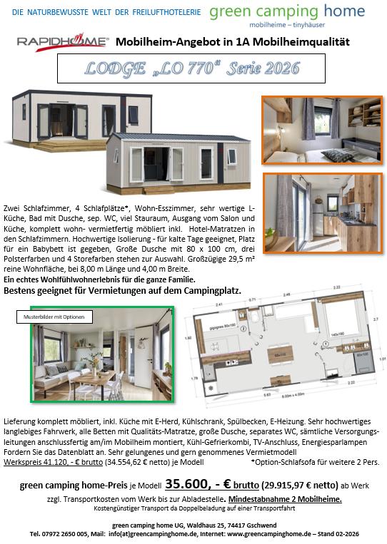 Diese GEWERBE-AKTIONEN von Mobilheimen sind immer sehr begrenzt. Durch Verhandlung mit dem Werk konnte für das jeweilige Mobilheim-Angebot ein besonderer Preis ausgehandelt werden. Lieferzeit richtet sich nach der vorhandenen Werkskapazität. Farben von Sofa wie auch der Sichtwände und der Store können frei gewählt werden. Sollten Sie weitere Zusätze (optional - Mehrpreis) wünschen, Beispiel Frontfarbenänderung - Zusatzheiozkörper - usw., so ist dies im Bestellvorgang gegeben und wird berücksichtigt.