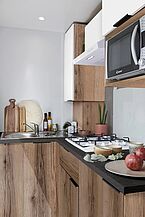Das LODGE LO67Mobilheim von RAPIDHOME Mobilheime ist in hochwertiger Ausführung mit bis 4 Personen ausgelegt. Bei 6,70 m x 4,00 m (lxb) haben Sie 24,50 m² Gesamtwohnfläche und können kompakten Wohnkomfort erwarten. Das Bad hat einer sehr großen Dusche (120 x 80 cm) und ist mit einem Waschbecken ausgestattet. Ein separates WC vervollständigt die Nassbereiche. Wohnen, Essen und kompakte L-Küche fließen ineinander ein und bieten angenehmen Platz um auch an ungemütlichen Wettertagen es sich bequem zu machen. Das Sofa ist in sehr hochwertigen Ausführung gefertigt. Der Eltern-Schlafbereich hat grundsätzlich das Master-Bett mit 140 x 190 cm im Lieferumfang. Das Gästezimmer hat 2 Betten mit 80 x 190 cm. Die Mobilheimfronten können Sie als Option in anderen Farb-Ausführungen bekommen. Das Fahrwerk in dieser Mobilheim-Klasse ist sehr robust und auf lange Lebensdauer ausgelegt. Die Mobilheimqualität und die Ausführung ist im gehobenen Mobilheimsegment einzustufen.